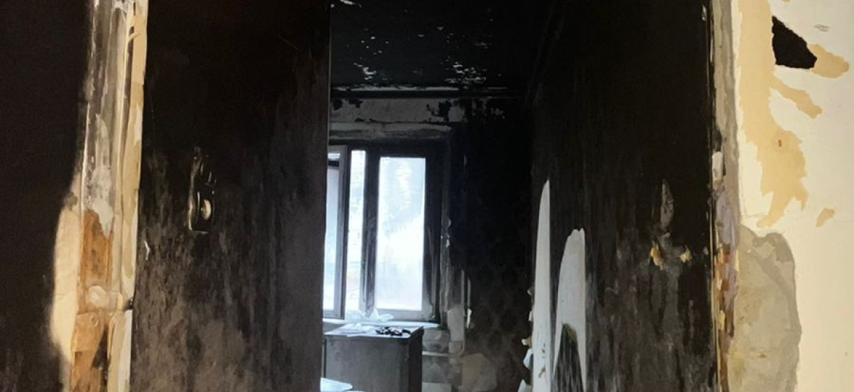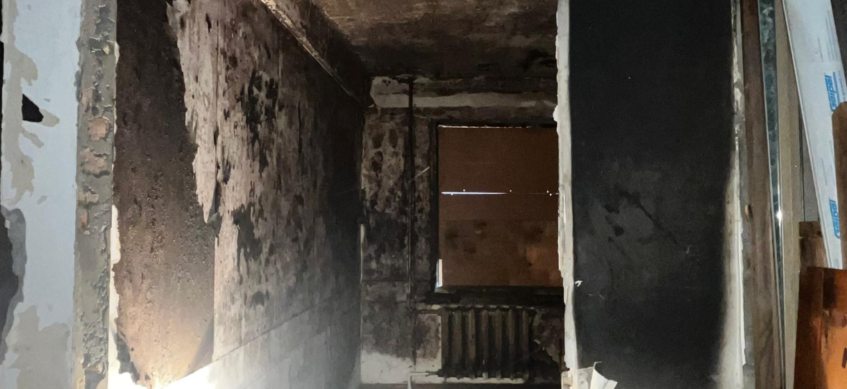 Одна комната сгорела до бетона, в остальных – чёрные стены, обугленные двери, потолки в копоти.